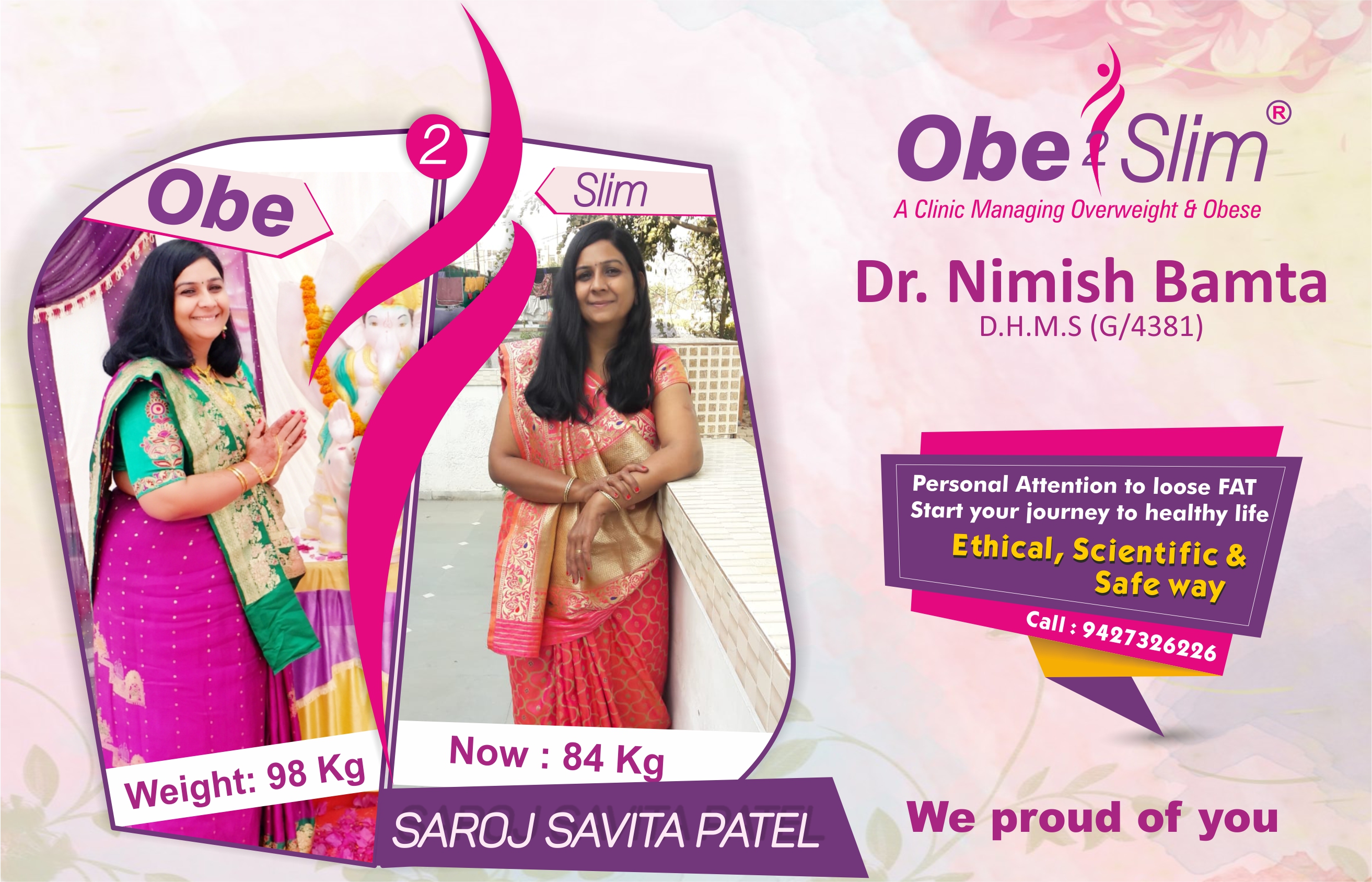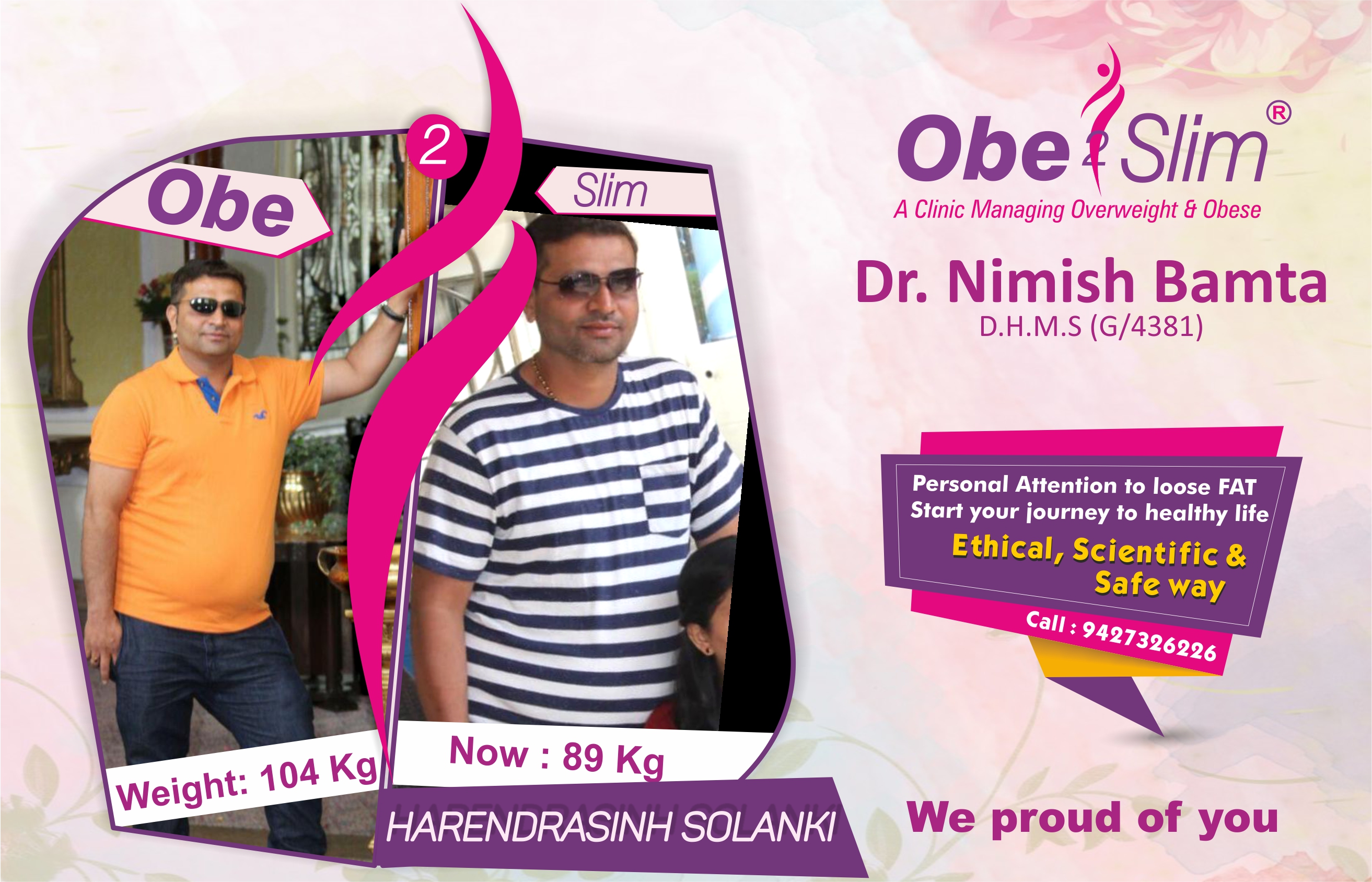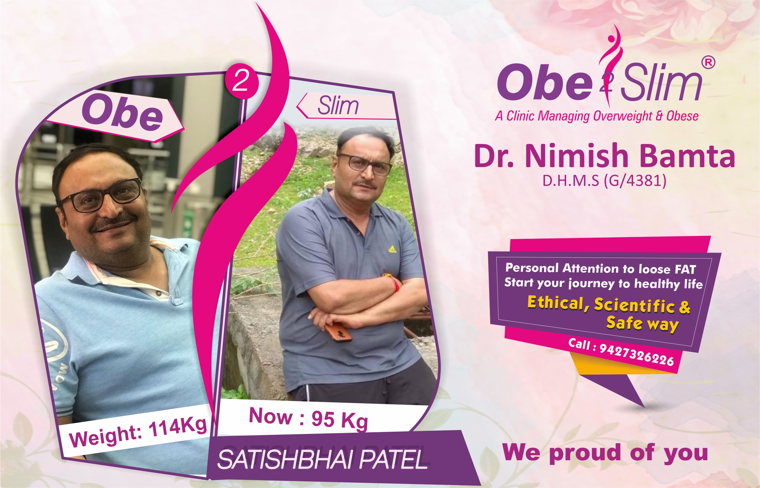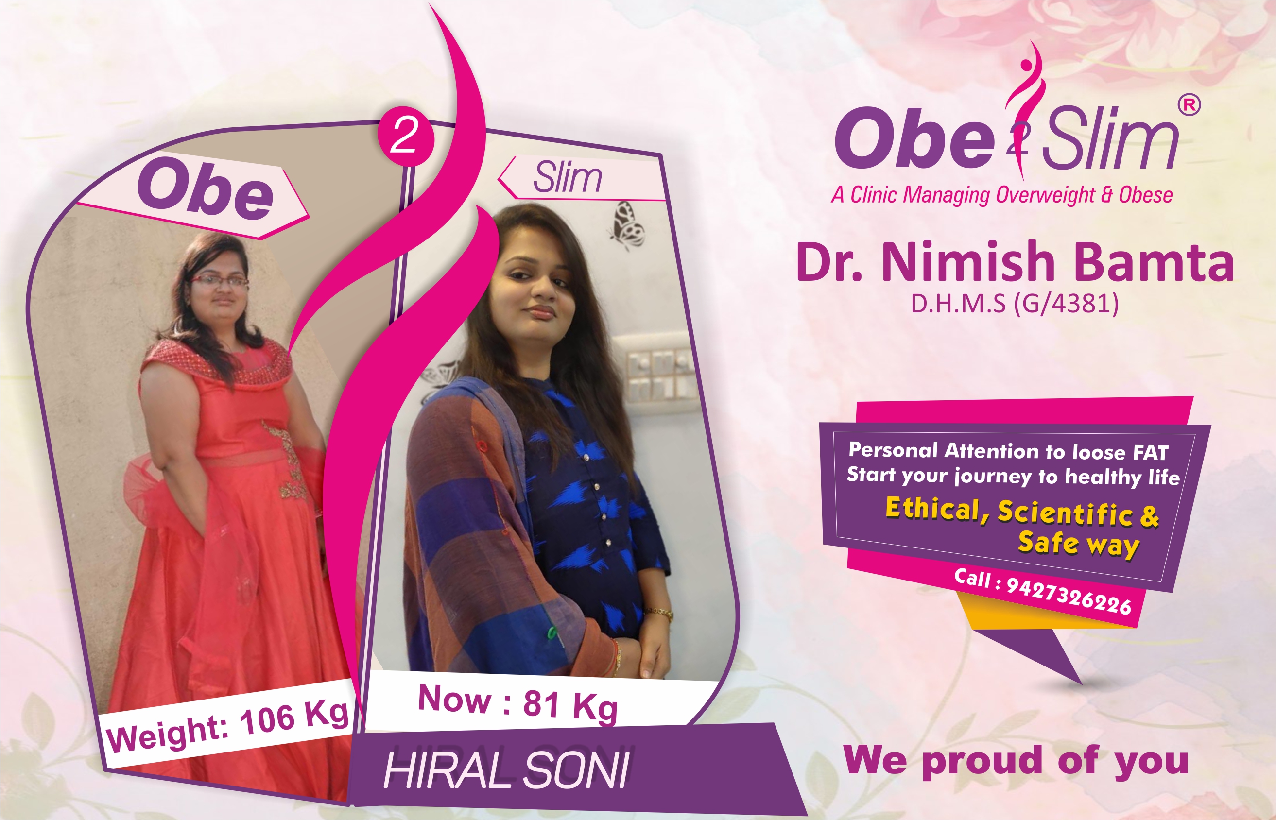 Obe2Slim is Obesity, Weight Loss and Hormone Clinic Successfully treated more than 10000 people in satellite, Ahmedabad and also all over Gujarat. We just don’t go for Cosmetic Weight Loss / We Search cause of gaining Weight; try to help to relief in diseases & physical complain developed after gaining weight. We are offers slimming centre is best affordable cost overweight reduce doctor, obesity expert doctor, overweight treatment clinic, female weight loss center, ayurved doctor for weight loss, obesity treatment clinic and fat loss clinic, fat reduce clinic, 100% guaranteed weight loss doctor, diet plan advisory doctor hospital, No1 top senior weight loss doctor in Ahmedabad.